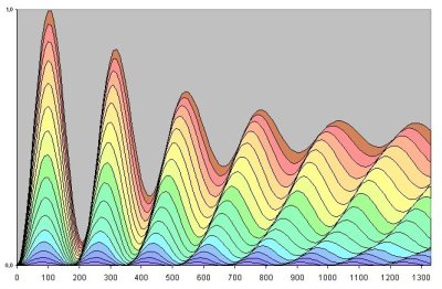 Analysis of the thickness The reflected light on the water film is composed of two parts, the reflection from the top and from the bottom. The light will be at a maximum when the two components are in phase. The light from the top of the film comes from the air and is reflected at the medium with higher density so it makes a phase jump of 180°. The light that is reflected at the bottom of the film makes no phase jump, so it just has to travel for a quarter of a wavelength through the layer forth and another quarter of the wavelentgh back to reach the same phase. Measured at the yellow light with 580nm, a quarter of a wavelength is 145nm and in water ist is just 110nm. This thickness is easy to recognise in fig1. It is the first maximum where the maxima for all colours are close together and the appearance of the line is almost white. It is in fact yellow, as some blue and red parts are slightly shifted out but not that much that all colours appear as a rainbow. Further on at a thickness of about 200nm all colours are interfering and a very characteristic dark or non reflective line appears. At the next maximum the colours show more dispersion and they can be observed separately. The next minimum is not so low and more rainbows follow. The ends of the visible spectrum start to overlap from the third maximum but with little intensity so that still a change of colours can be observed. |