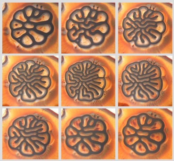 At some locations the lines are closed at the border of the round magnet underneath, at other locations they are open, a bubble might be enclosed by the lines.