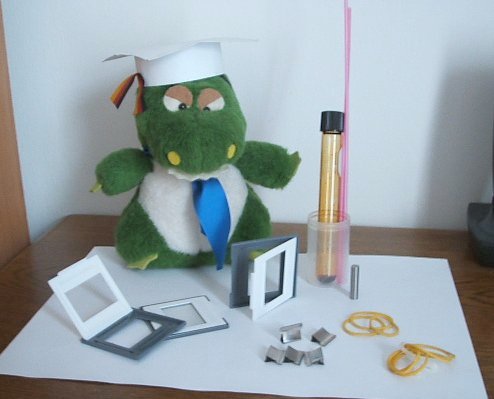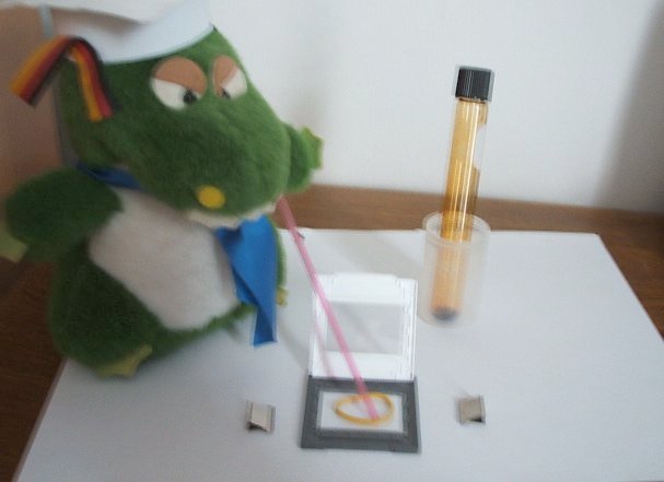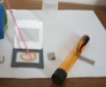 As shown in figure 1 the ingredients are: cover slips with glass, small rubber rings, paper clips and just a few drops of magnetic fluid. Figure 1 also shows thin plastic straws and a magnet together with the magnetic fluid for better handling, tissue paper should be added.