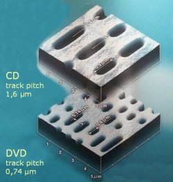 Diffraction measurement with CD and DVD An other type of grid with high precision is very common, it is the CD ROM. The grid is standardised so that its pitch is just known as 1.6 µm for the CD and 0.74 µm for the DVD. With a perpendicular laser beam being reflected from the surface, the angle of diffraction is much larger than with the ancient memory chip. For a wavelength of 650 nm it is 24° and 54° for the CD and 61° for the DVD fig 4. |
