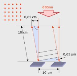 Regarding the blue triangles one with the base of 10µm, between the cells and the other with a basis of 10cm, more or less the distance to a screen, one can say, that the next point on the screen will be 0,65cm aside from the direct reflection. With all other points where the difference between neighbouring reflections is a whole number of wavelengths, a regular pattern appears. |